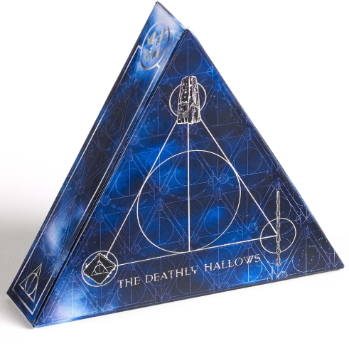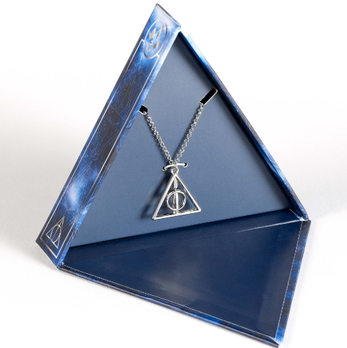 Ce coffret cadeau renferme un collier unique mettant en vedette le symbole emblématique des Reliques de la Mort. Le pendentif, finement détaillé, est rotatif, permettant à ses différentes parties (la baguette, la pierre et la cape) de bouger librement.