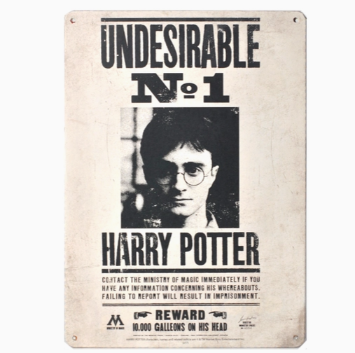 Apportez une touche vintage et rebelle à votre décor avec ce panneau en étain inspiré de l’avis de recherche Indésirable No.1™ tiré de l’univers Harry Potter™. Reproduisant l’affiche emblématique diffusée par le Ministère de la Magie™, il met en vedette Harry Potter™ tel qu’il apparaissait pendant la sombre période de la chasse aux sorciers.