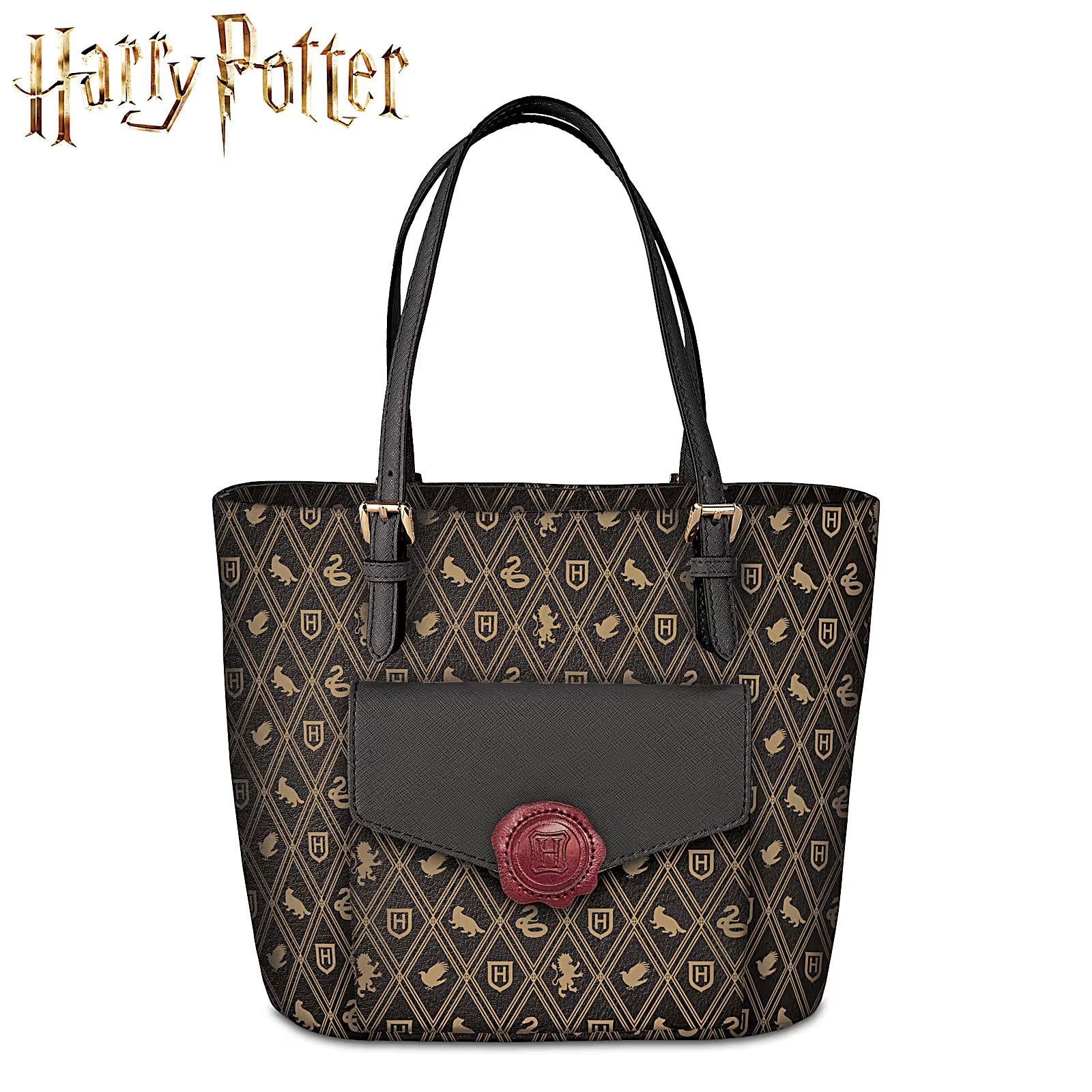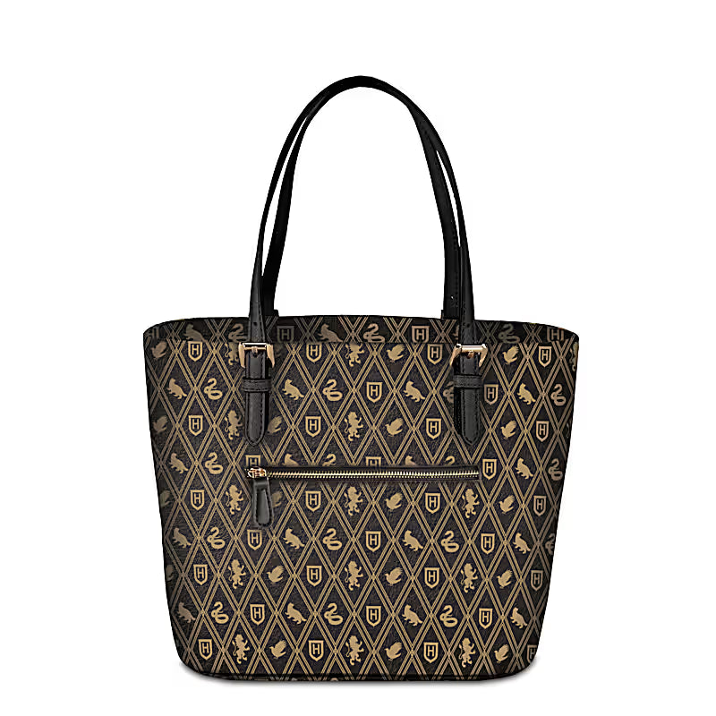 Affichez fièrement votre appartenance aux maisons dans un style intemporel. Le sac fourre-tout Heritage HOGWARTS™ marie une allure designer à une fonctionnalité idéale au quotidien. Confectionné en faux cuir lisse, il est orné d’un motif tan répété représentant les symboles des quatre maisons de HOGWARTS™, et rehaussé d’une poche avant de style enveloppe, fermée par un accent sculpté effet « sceau de cire » embossé de l’emblème HOGWARTS™.