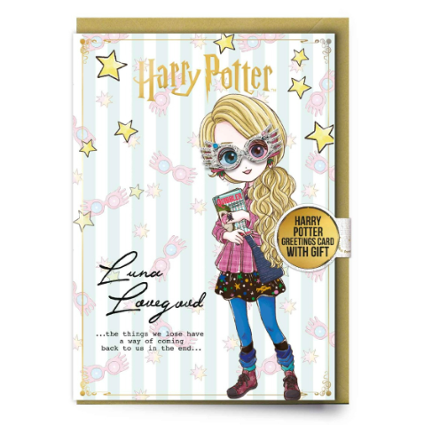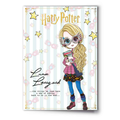 Celebrate Luna Lovegood's eccentricity and good humor with this stunning illustrated greeting card featuring her. It comes with a matching pin, perfect for personalizing a bag, jacket, or pencil case.