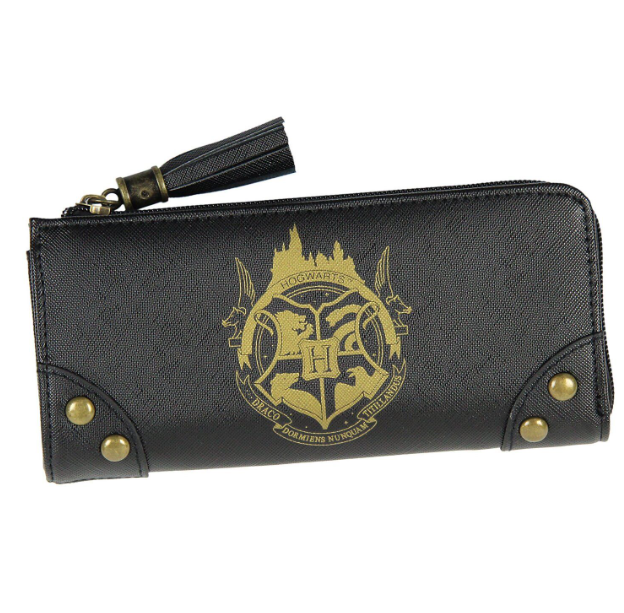 Transportez un peu de la magie de Poudlard™ partout avec vous grâce à ce portefeuille raffiné. Son élégant revêtement noir est sublimé par l’emblème doré de l’école de sorcellerie, symbole intemporel de sagesse et de grandeur. Doté de détails métalliques sophistiqués et d’une fermeture éclair agrémentée d’un pompon, cet accessoire allie style et praticité. Avec ses multiples compartiments, il est idéal pour ranger vos cartes, billets et pièces en toute sécurité, tout en affichant fièrement votre appartenance au monde magique.